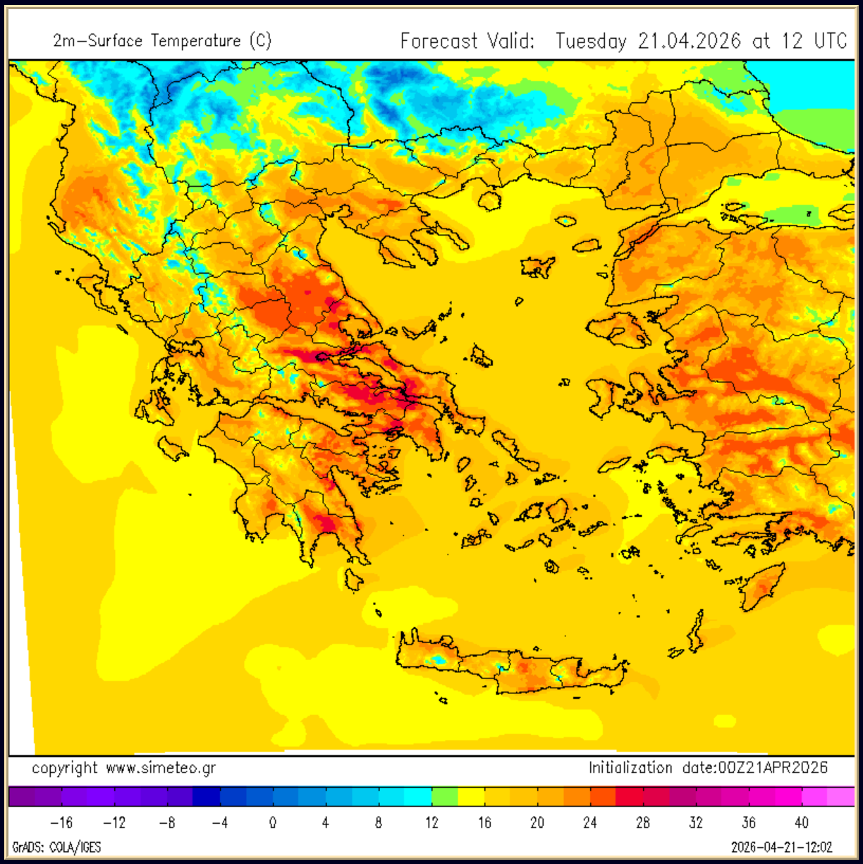 ➢ Η κατανομή αυτή όπως και το όλο σκηνικό του καιρού αλλάζει την Τετάρτη (22.4.2026) καθώς το βαλκανικό ψυχρό μέτωπο θα διασχίσει την περιοχή μας από Βορρά προς Νότο προκαλώντας μεταβολή του καιρού με εκτεταμένη συννεφιά, διαστήματα βροχής, και σποραδικές καταιγίδες, επικράτηση βορείων ανέμων και αισθητή πτώση της θερμοκρασίας.