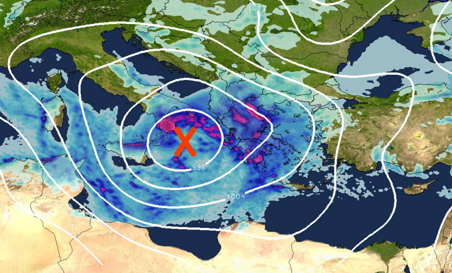 Ένα νέο βαρομετρικό χαμηλό από την Κεντρική Μεσόγειο, το οποίο είναι πολύ βαθύ και ιδιαίτερα οργανωμένο θα επηρεάσει τη χώρα μας από αργά το βράδυ του Σαββάτου. Το χαμηλό αυτό συνοδευόμενο από μέτωπο κακοκαιρίας θα παραμείνει για πολλές ώρες στο Ιόνιο, παρουσιάζοντας έντονη στρεφόμενη κίνηση, με αποτέλεσμα να εμπλουτίζεται συνεχώς με υγρασία και ενέργεια.